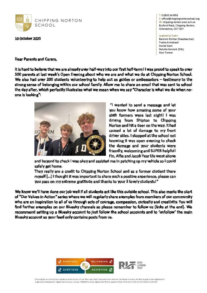 It is hard to believe that we are already over half-way into our first half-term! I was proud to speak to over 500 parents at last week’s Open Evening about who we are and what we do at Chipping Norton School. We also had over 200 students volunteering to help out as guides or ambassadors – testimony to the strong sense of belonging within our school family. Allow me to share an email that was sent to school the day after, which perfectly illustrates what we mean when we say “Character is what we do when no-one is looking”: