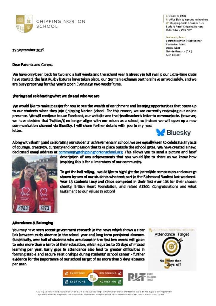 We would like to make it easier for you to see the wealth of enrichment and learning opportunities that opens up to our students when they join Chipping Norton School. For this reason, we are currently reviewing our online presence. We will continue to use Facebook, our website and the Headteacher’s letter to communicate. However, we have decided that Twitter/X no longer aligns with our values as a school, so instead we will open up a new communication channel via BlueSky. I will share further details with you in my next letter.