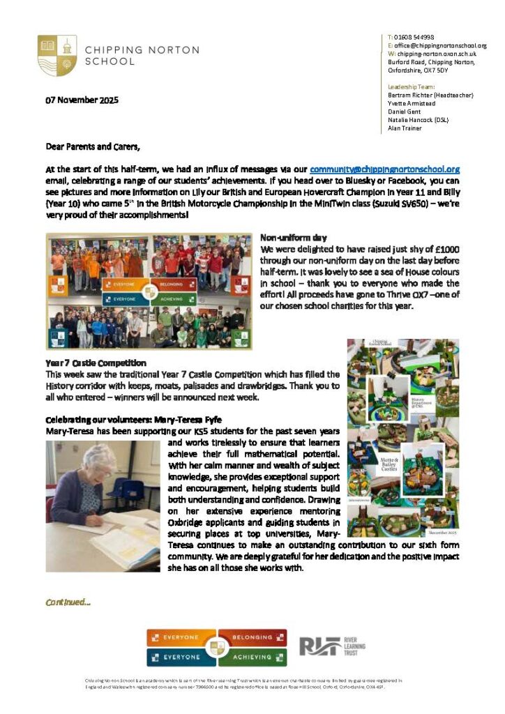 At the start of this half-term, we had an influx of messages via our [email protected] email, celebrating a range of our students’ achievements. If you head over to Bluesky or Facebook, you can see pictures and more information on Lily our British and European Hovercraft Champion in Year 11 and Billy (Year 10) who came 5th in the British Motorcycle Championship in the MiniTwin class (Suzuki SV650) – we’re very proud of their accomplishments!