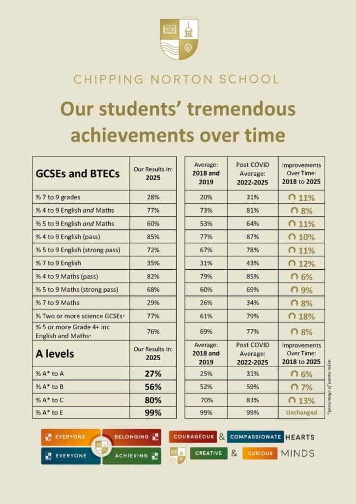 GCSEs and BTECs | Our Results In: 2025 | Average: 2018 and 2019 | Post COVID Average: 2022-2025 | Improvements Over Time: 2018 to 2025 |